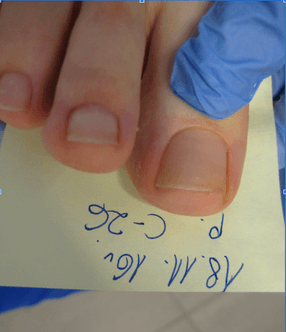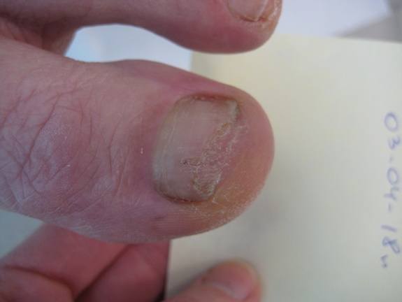 VII - VIII wizyta w odstępach miesięcznych - kontrola paznokcia, produkty do stosowania miejscowego, pacjentka jest bardzo systematyczna, ponowna dezynfekcja kilku par obuwia, paznokieć odrośnięty zdrowy prawie w 100%.